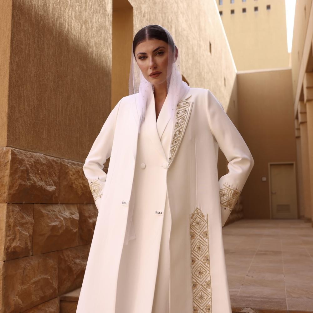 جاكيت كريمي أنيق بتطريز ذهبي مستوحى من الزخارف النجدية الأصيلة.